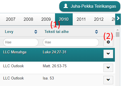 Kirjaudu nettiselaimella palveluun ja valitse soittolista (1) valikosta. Soittolistan oikeassa yläkulmassa on asetukset-linkki (2), josta saa auki ikkunan "Soittolistan asetukset". Soittolistan asetuksissa on kenttä "Linkki ulkoiseen järjestelmään" (3), jonka linkin voi kopioida ja liittää muihin järjestelmiin tai laitteisiin. Soittolistalinkki on henkilökohtainen ja se toimii vain, jos käyttäjällä on kuunteluaikaa palvelussa.